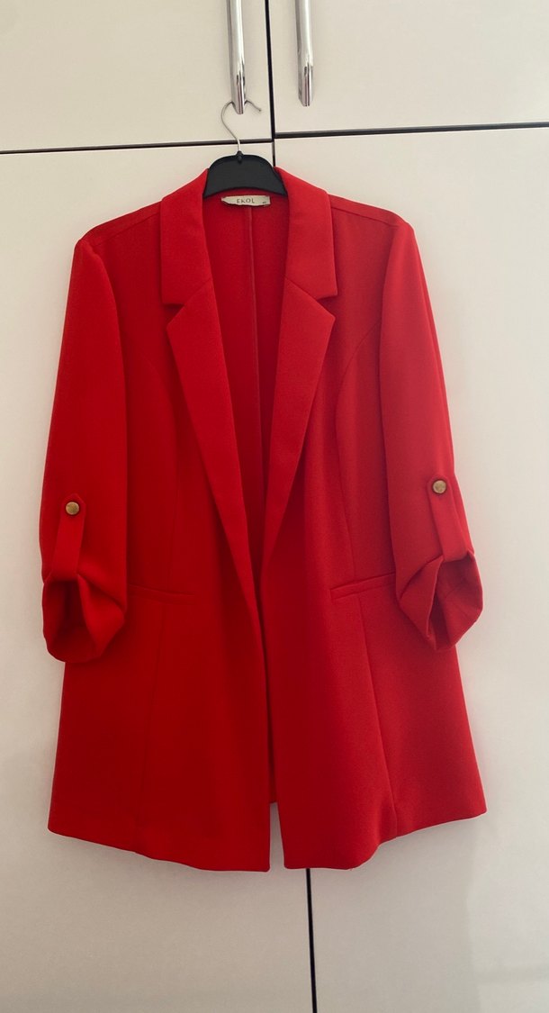 Kırmızı düğmeli, uzun kollu, klasik kesim, orta boy kadın blazer. Yumuşak ve sıcak kumaştan, desen içermeyen parlak yüzeyli.