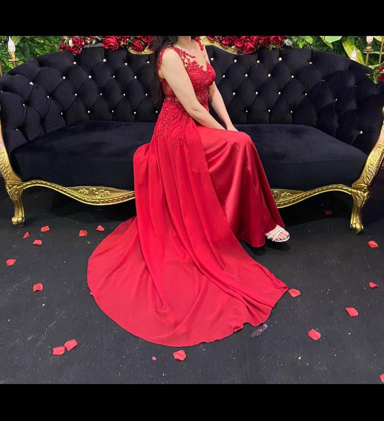 Klasik Kırmızı İşlemeli Uzun Abiye Elbise