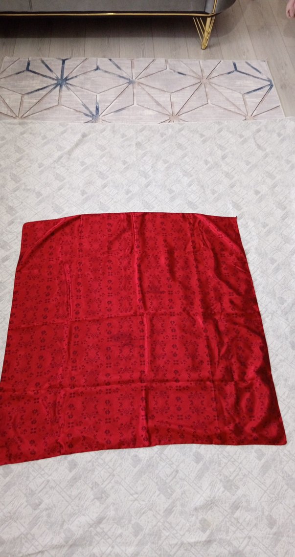 Parlak kırmızı sentetik kumaştan, bohem ve retro tarzda, rahat bir görünüm sunan klasik kadın fuları.