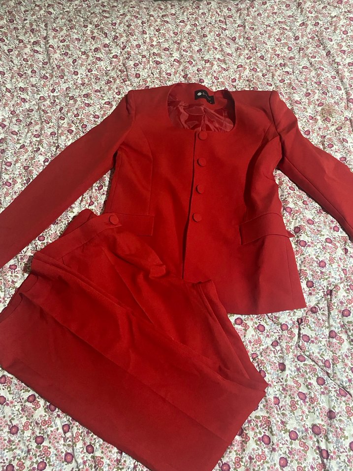 Bu kadın takımı koyu kırmızı renkte, kesik yakalı ve uzun kolludur. Düğmeli önü ve rahat kesimi ile ofis için uygundur.