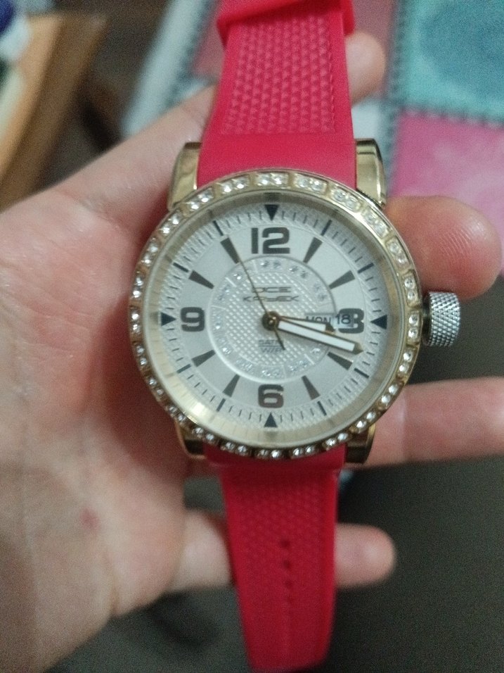 Kırmızı kayışlı, klasik tarzda kadın kol saati. Kadranda 6, 9 ve 12 rakamları bulunur. Taşlı çerçevesi ile şık bir görünüm sunar.⌚ hediye geldi hiç kullanmadım alan kişinin pilini değişmesi lazım