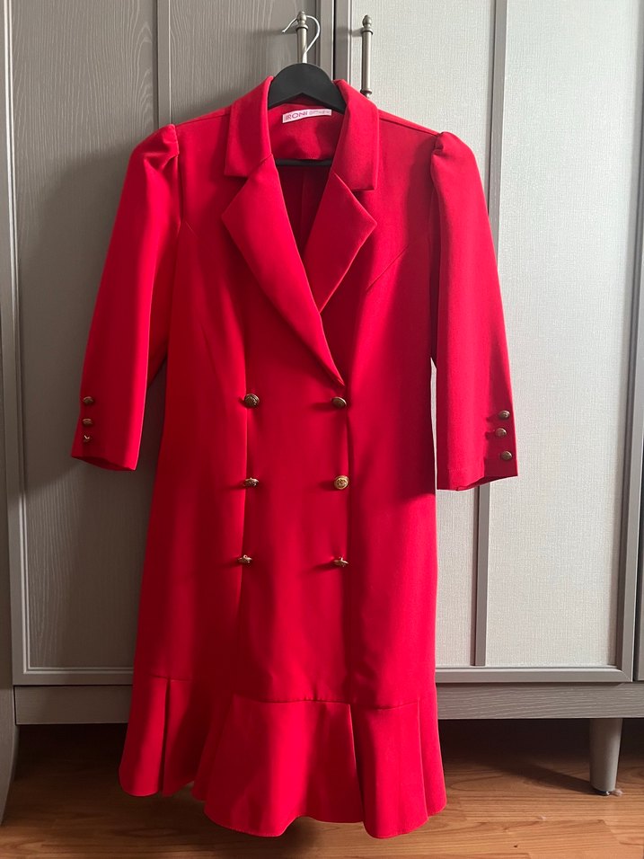 kırmızı ceket elbise, keskin yaka ve düğmeli ön detaylarla modern klasik tarz sunar. Ofis kullanımı için uygundur, uzun kollu ve rahat kesimdir. Yakın arkadaşımın kınasında giydim