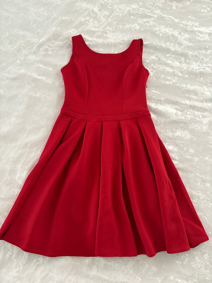Kolsuz, fitted bel, parlak kumaşlı kırmızı midi abiye elbise. Kayık yaka detaylı, parti için uygun.