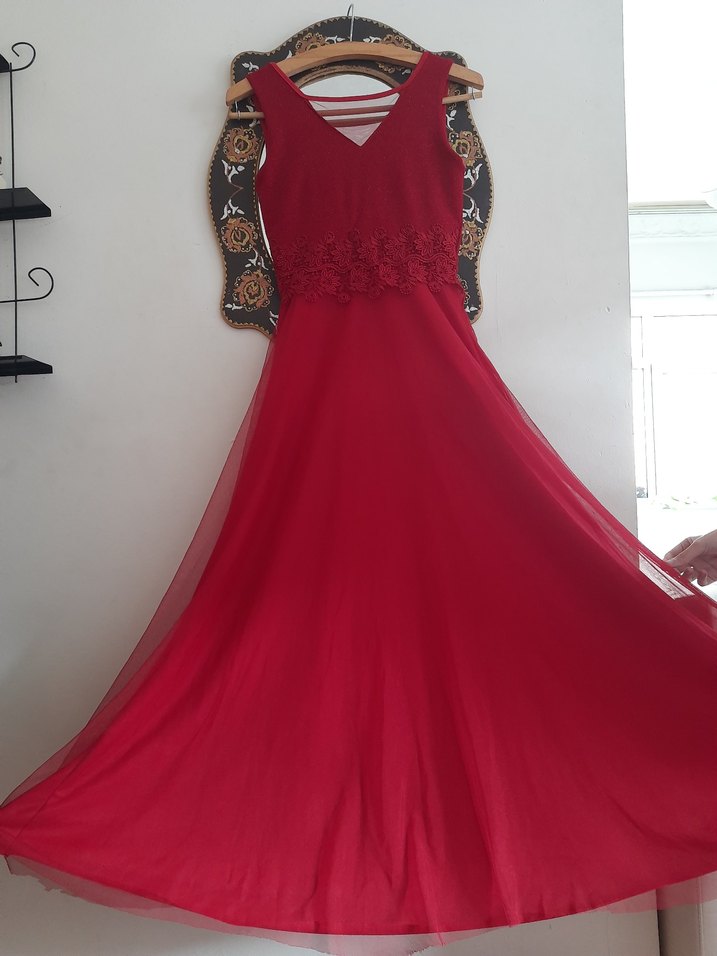 Klasik Kırmızı Nakışlı Uzun Abiye Elbise