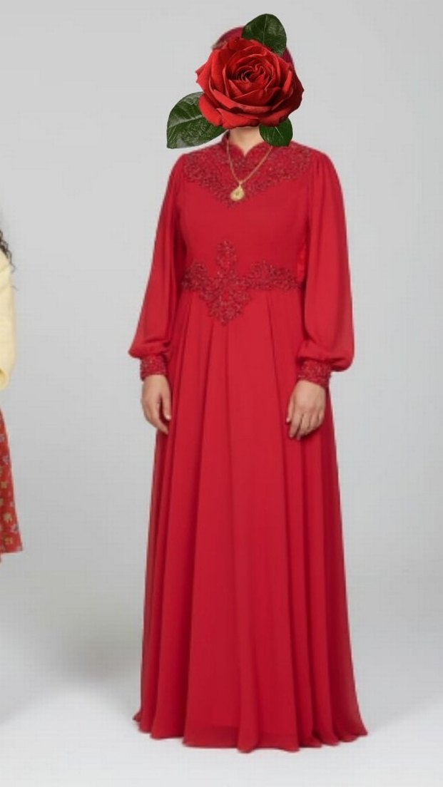 Yüksek yakalı, uzun kollu kırmızı uzun elbise. Salaş ve drapeli kesimi, parlak nakış detayları ile düğün ve özel günler için uygun.