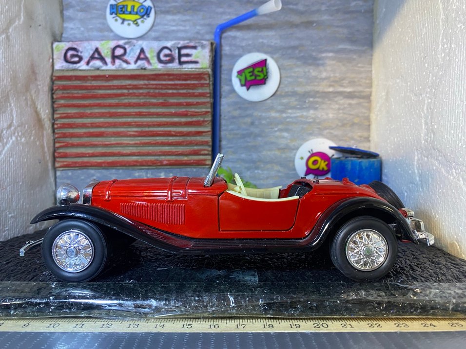 Klasik kırmızı oyuncak araba, açık tavan ve gerçekçi tekerleklerle detaylı tasarıma sahiptir. Arka planda renkli yazılar bulunur.