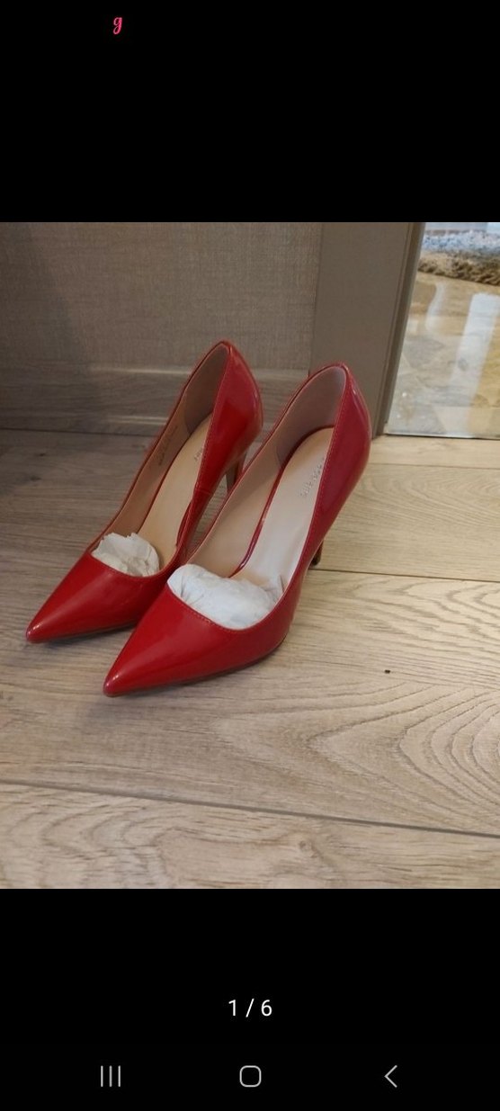 Kırmızı parlak stiletto topuklu, sivri burunlu kadın ayakkabısı. bir kez evde giyildi