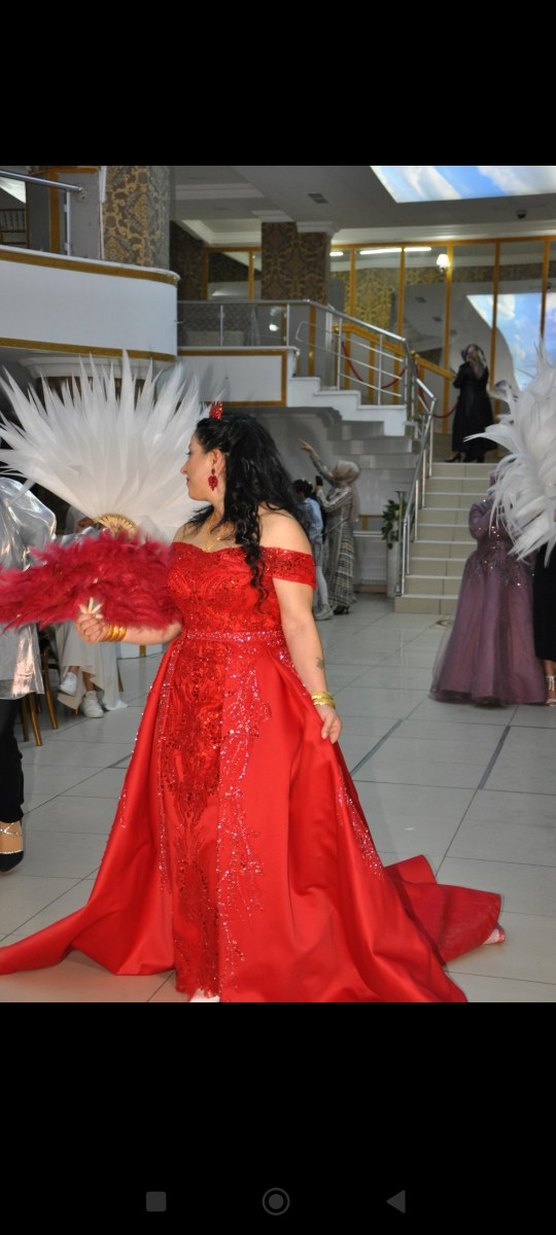 Kırmızı, straplez, uzun ve işlemeli abiye elbise. Drapeli tasarımı ve parlak detaylarıyla düğün için klasik ve şık bir görünüm sunar. Kolsuz ve regular fit.