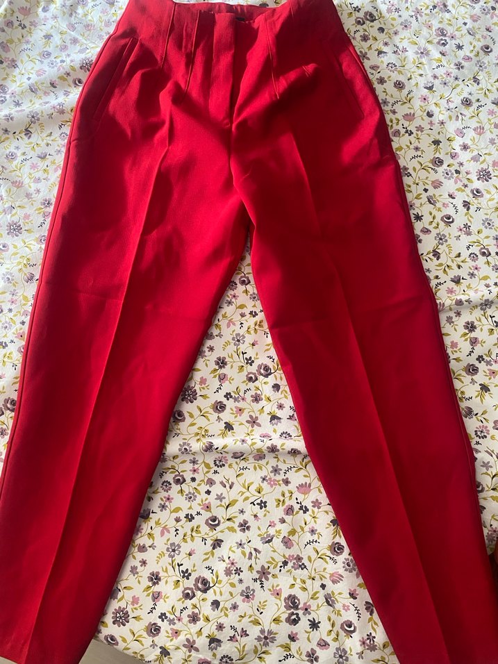 Satın aldım hiç giymedim Kırmızı renk, pilili ve midi boy klasik kesim kadın kumaş pantolon. İpeksi dokusu ve vintage esintili sokak stili ile ofis kullanımına uygundur.