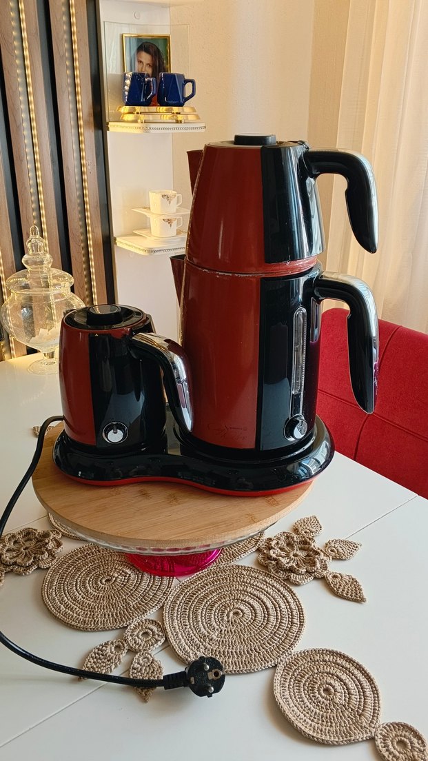 Koyu kırmızı ve siyah renkteki bu çay makinesi, ergonomik kulplu üzerindeki beyaz çizgi ışık yansımasıdır bilginize.