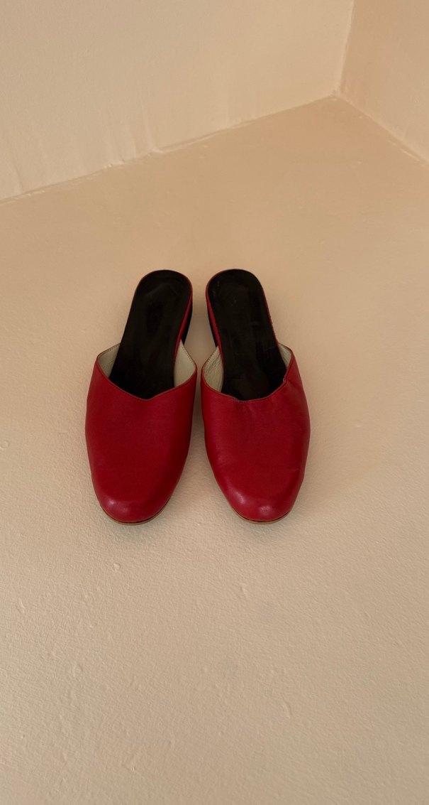 Özel üretim Koyu kırmızı renkte, stiletto topuklu kadın terlik. Deri malzemeden, desen içermeyen sade ve klasik tasarım. Günlük kullanım için rahat ve şık.