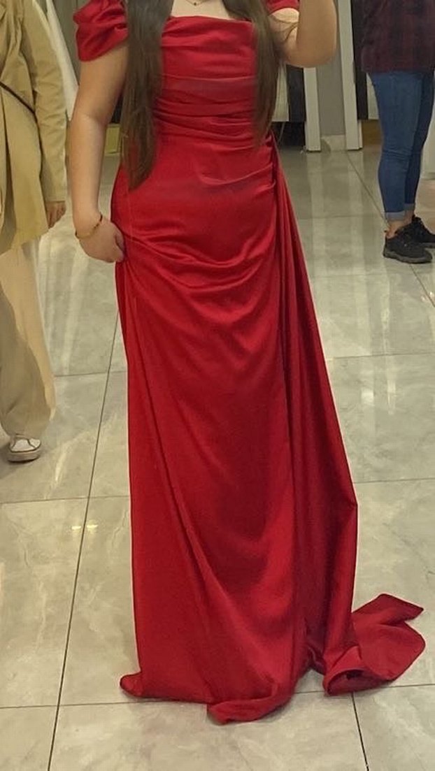Kırmızı, parlak kumaştan, straplez ve kolsuz uzun abiye elbise. Drapeli tasarımı ve klasik modern stiliyle düğünler için uygun. 1 kere giyildi