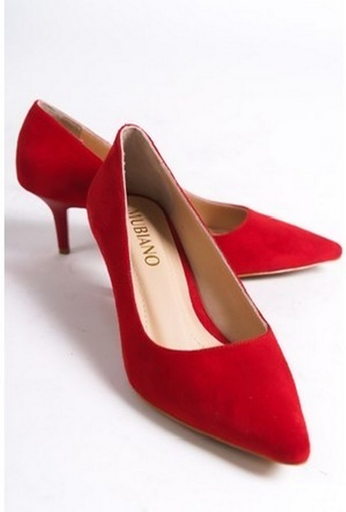 Kırmızı süet malzemeden yapılmış, sivri burunlu ve orta yükseklikte topuklu stiletto ayakkabılar. Ofis kullanımı için uygun, modern klasik tarzda ve zahmetsiz şıklık sunar. Marka: BIANO.