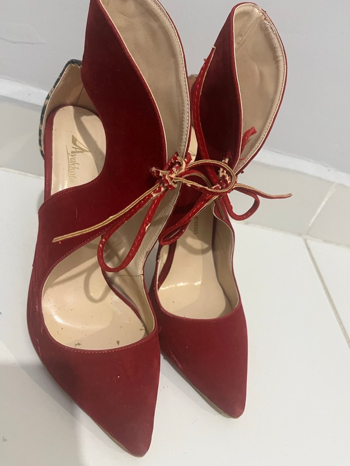 Parlak kırmızı süet malzemeden, stiletto topuklu v kadın gece ayakkabısı, romantik akşamlar için modern klasik tarzda. Fotoğrafları inceleyip alınız