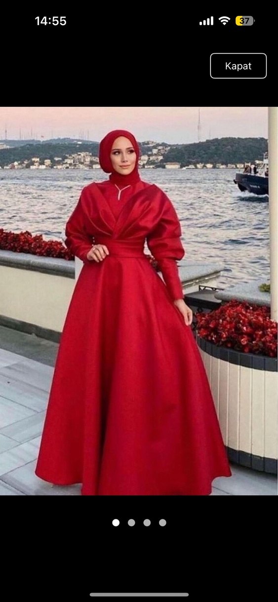 Yüksek yakalı, uzun kollu ve etnik desenli drapeli kırmızı uzun abiye elbise. Düzenli kesim ve parlak yüzeye sahip, düğünler için uygun. Kenzel abiye, arkasına ip yaptırdım daha geniş bedene de olur 38 40