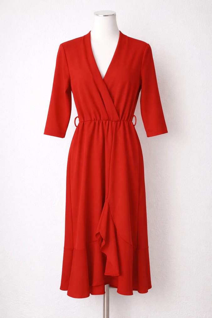 Kırmızı uzun ve beli kemerli elbise, V yakalı ve yumuşak, sıcak dokulu kumaştan üretilmiştir. Modern klasik tarzı ve günlük rahatlığı bir arada sunar.