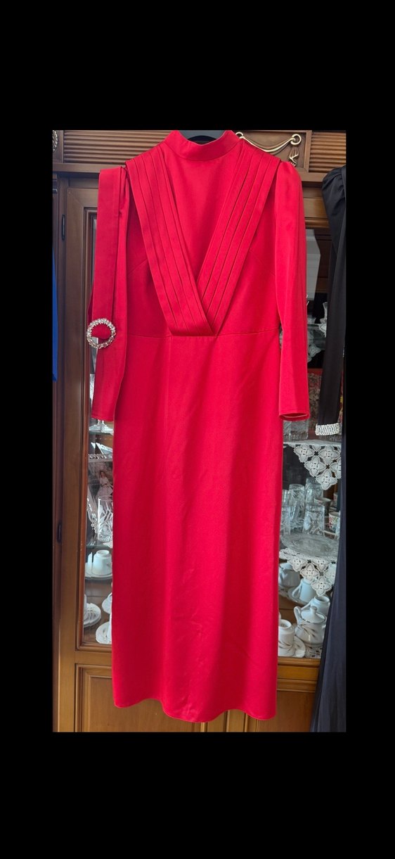 Uzun, yüksek yakalı, drapeli kırmızı elbise, ipeksi kumaş ve uzun kollu. Düğünler için modern klasik stilde, rahat kesim. ✨