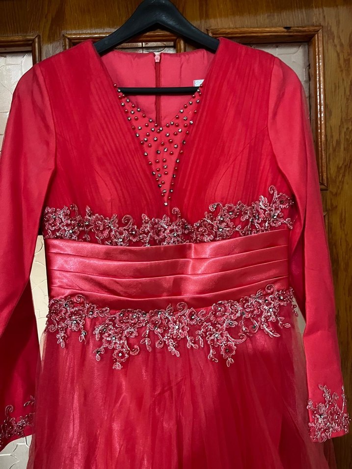 V yaka, uzun kollu kırmızı abiye elbise, işlemeli ve parlak detaylarla klasik şıklık sunar. Düğün için uygundur. ✨ İki koltuk altı 43 basen 55 boy 165 boy koltuk altından itibaren 140 cm’dir . Nar çiçeği rengindedir.