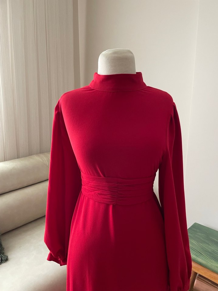 Yüksek yakalı, drapeli beli ve uzun kollu kırmızı uzun elbise, romantik akşamlar için çağdaş ve minimalist bir tarz sunar. Yumuşak ve sıcak kumaştan üretilmiştir. ❤️