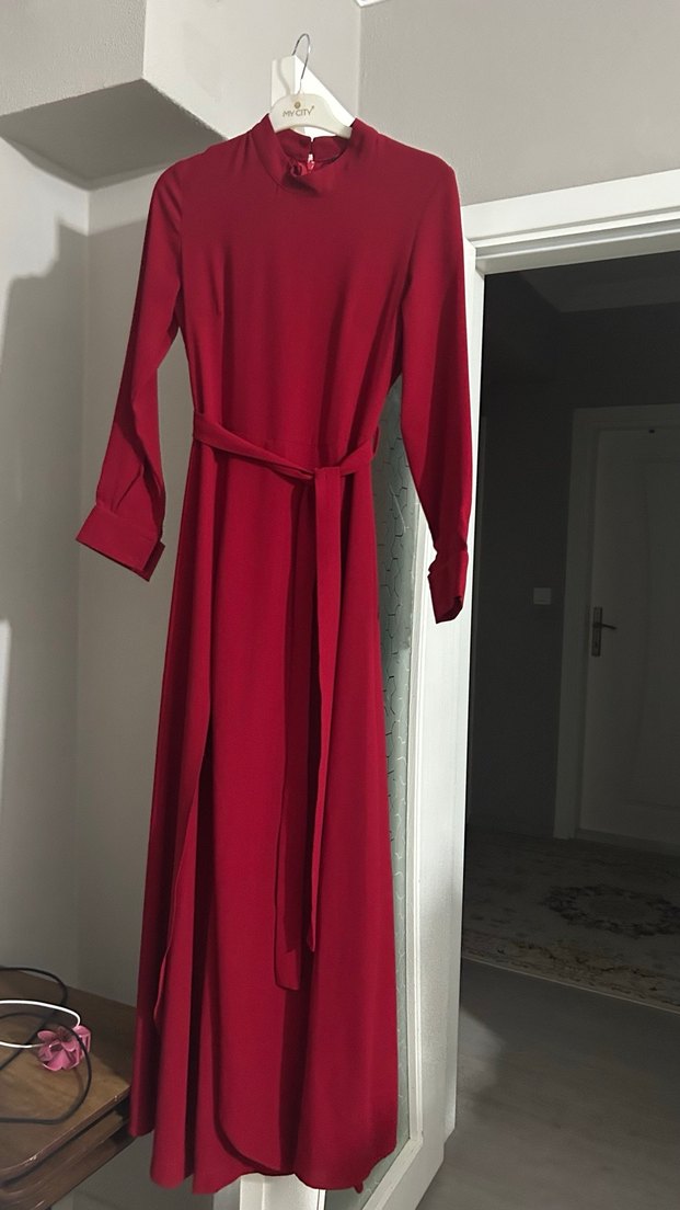 Kırmızı, yüksek yakalı ve uzun kollu, saten dokulu, drapeli ve kuşaklı uzun elbise. Romantik akşamlar için uygundur.