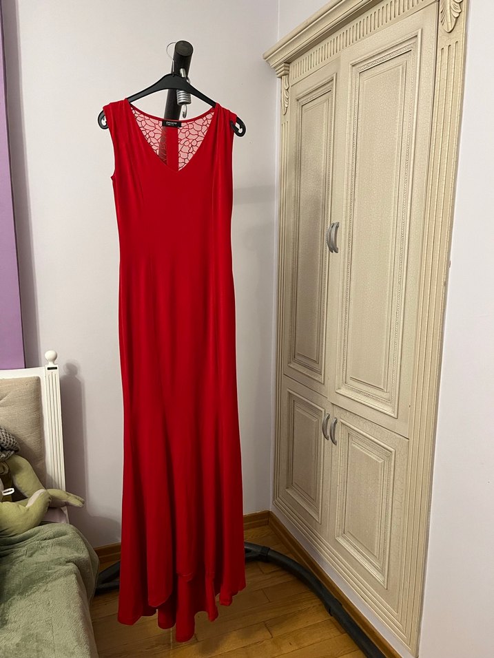Bu kırmızı uzun elbise, V yakalı ve drapeli klasik kesime sahiptir. Kolsuz ve parlak dokusuyla romantik akşamlar için uygundur. ❤️