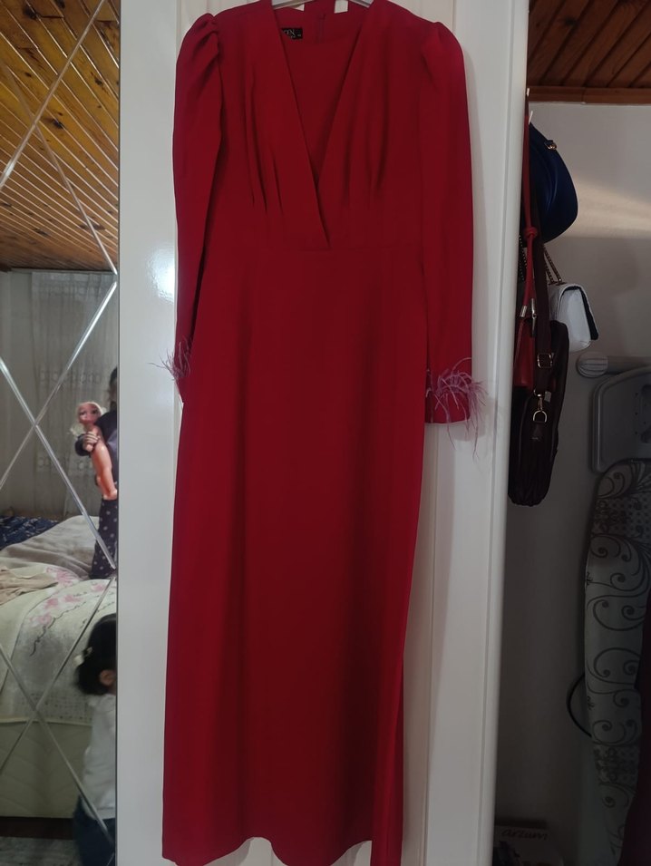 Koyu kırmızı renkte, drapeli V yakalı ve uzun kollu, tüy detaylı modern klasik tarzda uzun elbise. Romantik akşamlar için uygun.