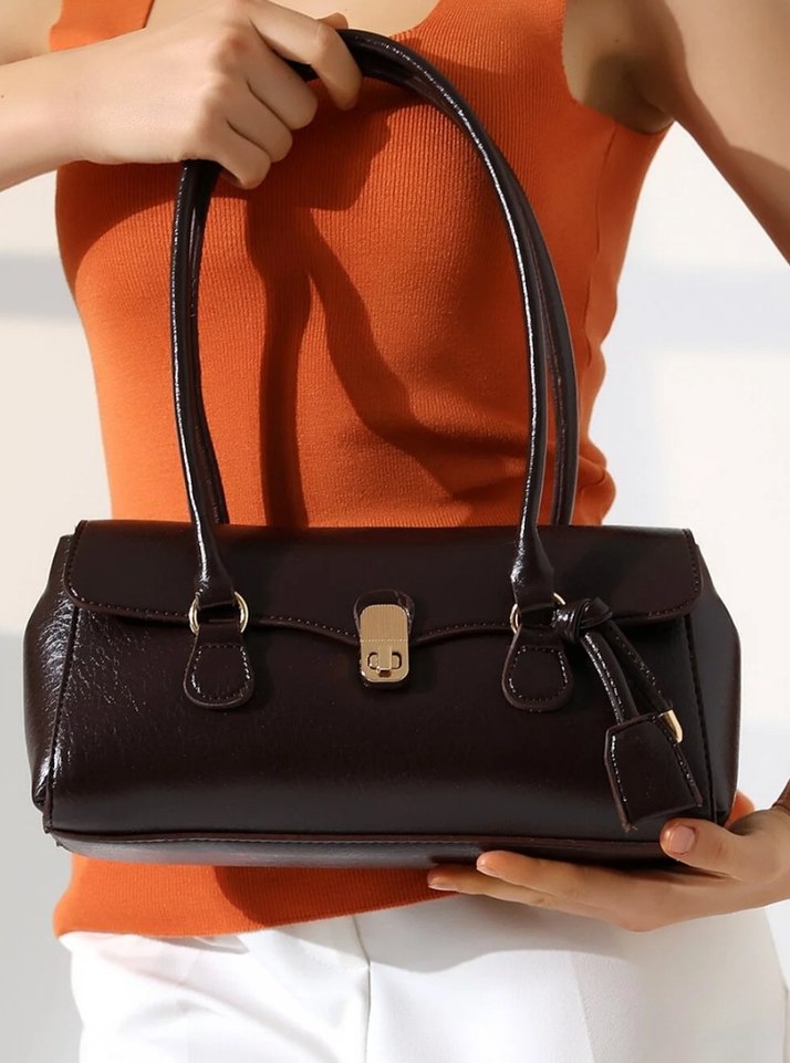Koyu kahverengi deri çanta, tokalı kapama ve desensiz şık tasarıma sahiptir. Modern klasik ve klasik zarafeti birleştirir, günlük kullanım için uygundur.