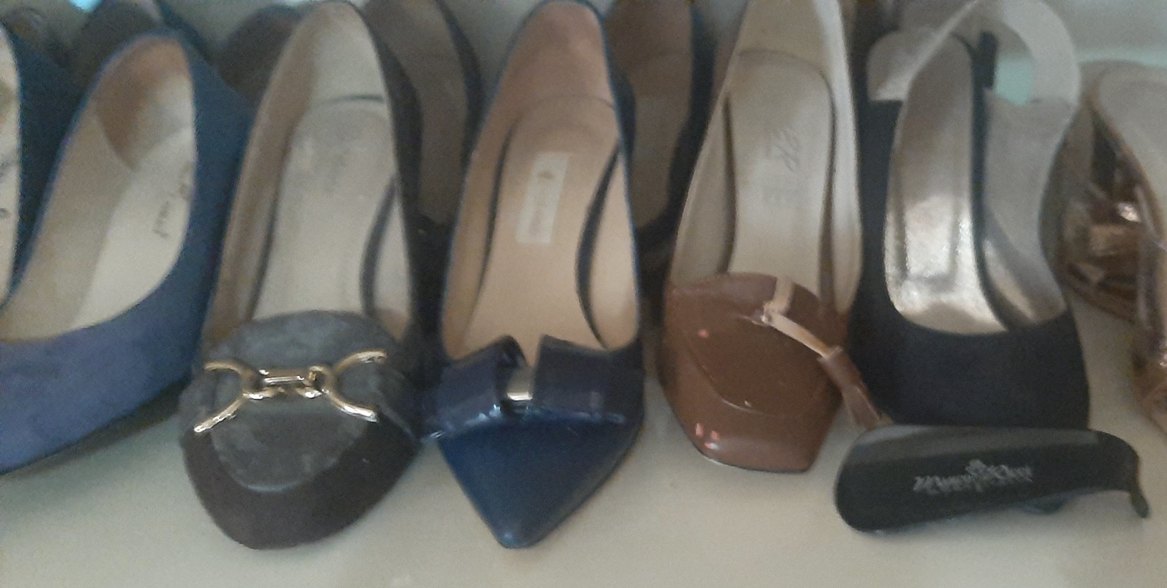Koyu mavi, tokalı ve kauçuk tabanlı stilettolar, ofis için çağdaş ve şık bir görünüm sunar.