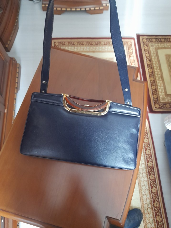 Lacivert deri kadın çanta, tokalı askı ve altın renkli kulpla modern klasik tarzda. Düz yüzeyiyle ofis için uygun şık bir modeldir.