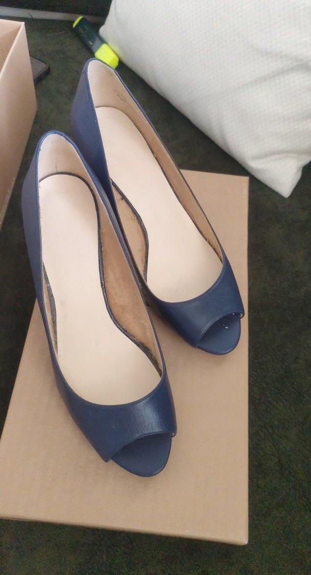 Koyu lacivert renkte, tokalı ve dolgu topuklu kadın ayakkabısı. Minimalist ve klasik zarafetle ofis şıklığına uygundur.