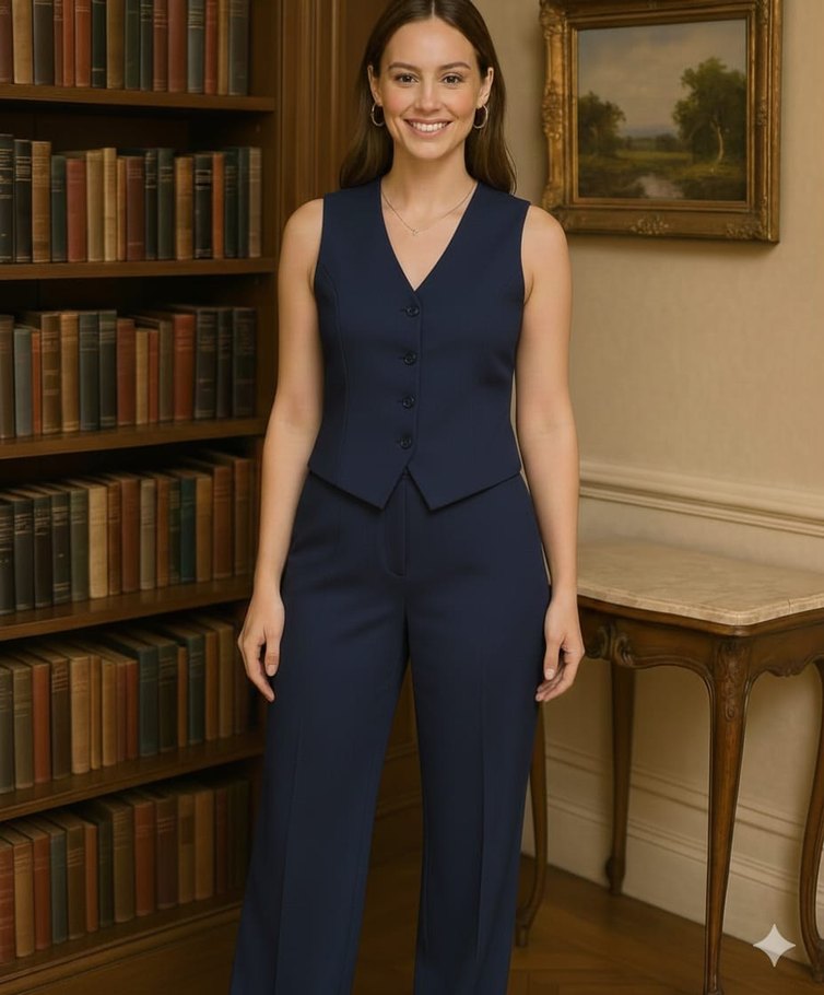Lacivert, düğmeli, kolsuz yelek. Notlu yakalı, ipeksi dokulu, normal kesim ve midi boyda, ofis için uygun.