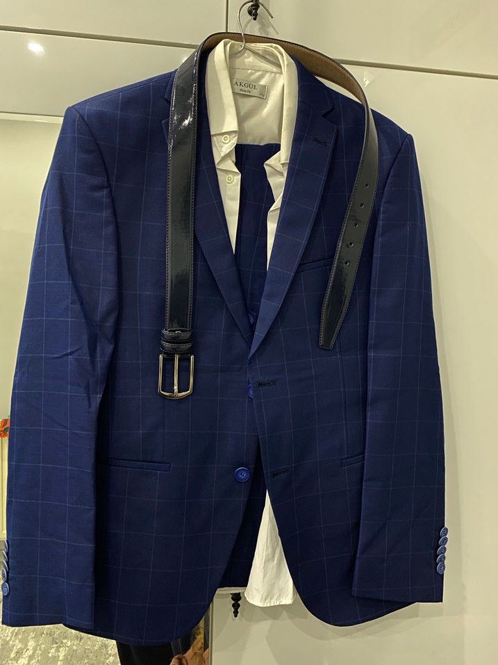 Koyu lacivert ekose desenli, notched lapel yaka ve regular fit kesime sahip erkek takım elbise. Kemerli ve askılı kollu, ofis ve sokak stiline uygun klasik şıklık sunar.S ve M bedenle uyumlu
