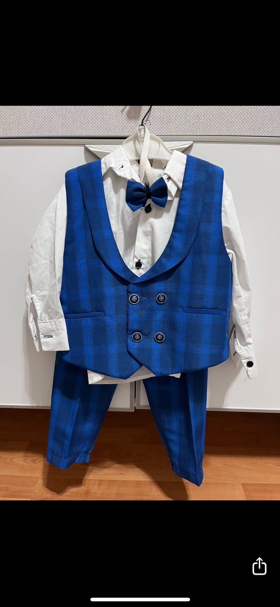 Klasik lacivert desenli, düğmeli yelek ve pantolonlu, beyaz gömlek ve mavi papyonlu erkek çocuk takım elbisesi.
