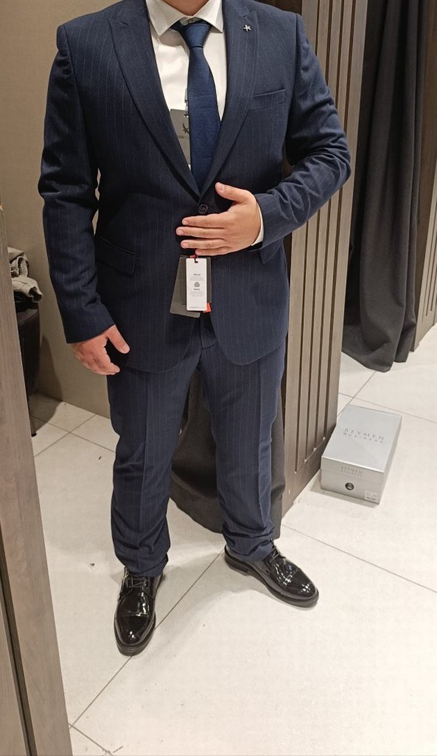 Lacivert renkli, klasik kesim erkek takım elbise. Notch yaka, uzun kollu ve kemerli tasarıma sahiptir. Ofis ortamına uygun, desen içermeyen midi uzunlukta. 1 kere giyilmiştir. Pazarlık payı vardır.