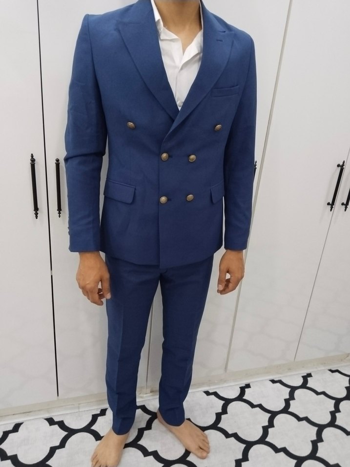 Lacivert klasik erkek takım elbisesi, kesik yaka ve düğmeli ön detaylara sahiptir. Uzun kollu, normal kesim olup.. Midi boyda ve şık bir tasarıma sahiptir.