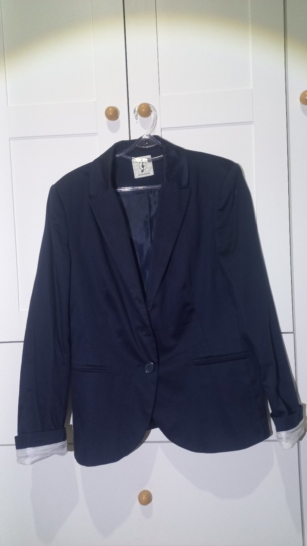 Koyu mavi kadın blazer ceket, kesik yaka ve düğmeli ön detayına sahiptir. İpek gibi kumaştan yapılmıştır, uzun kolludur ve klasik şıklıkla ofis kullanımı için uygundur.