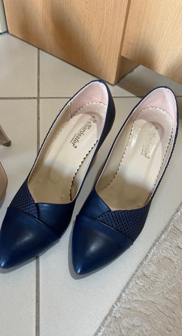 Koyu lacivert renkte, plise detaylı kauçuk malzemeden yapılmış klasik stilettolar. Ofis kullanımı için uygun, sivri burunlu ve geleneksel tarzda kadın ayakkabısı.