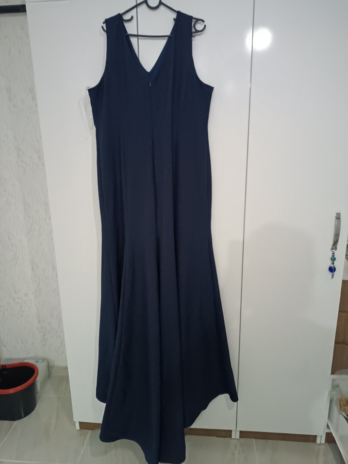 Lacivert uzun abiye elbise, kolsuz, V yakalı ve drapeli detaylıdır. Düz kesimle düğünler için uygundur.