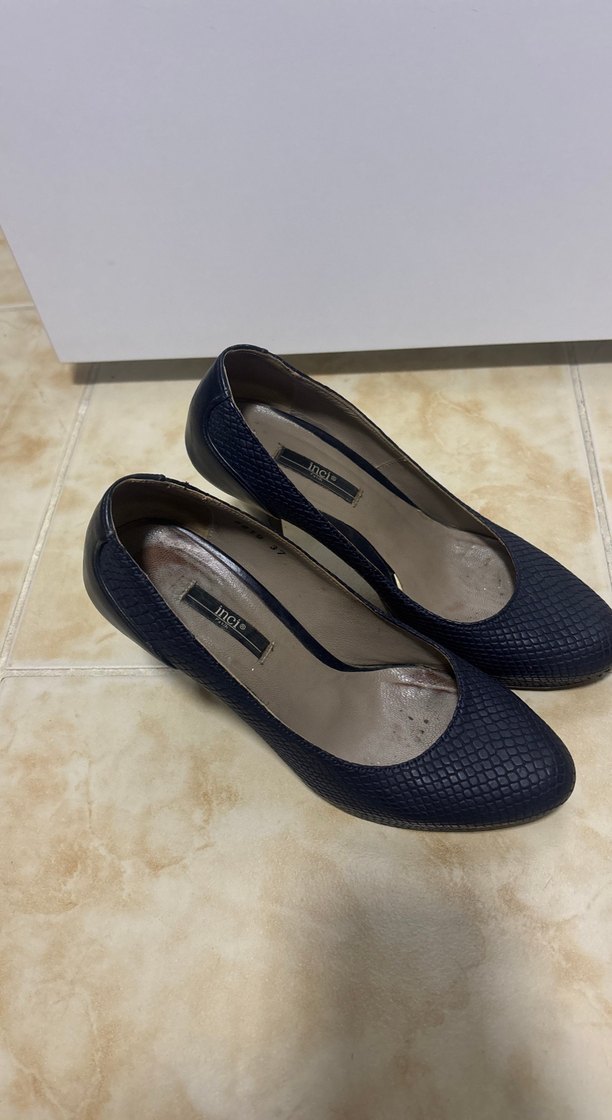 Koyu lacivert yılan derisi desenli, tokalı, kauçuk malzemeden klasik topuklu ayakkabı, ofis kullanımı için uygun.