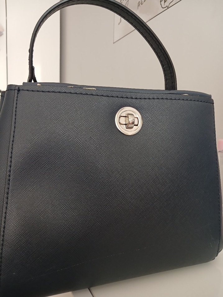 Modern klasik tarzda, baskılı dokulu mavi deri kadına özel, tokalı çanta, iş ve günlük kullanım için uygundur.