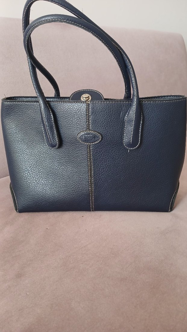 Koyu mavi deri kadın çanta, tokalı detayı ve modern klasik tarzıyla günlük kullanıma uygundur. Düz ve desen olmayan yüzeye, sağlam saplara sahiptir.
