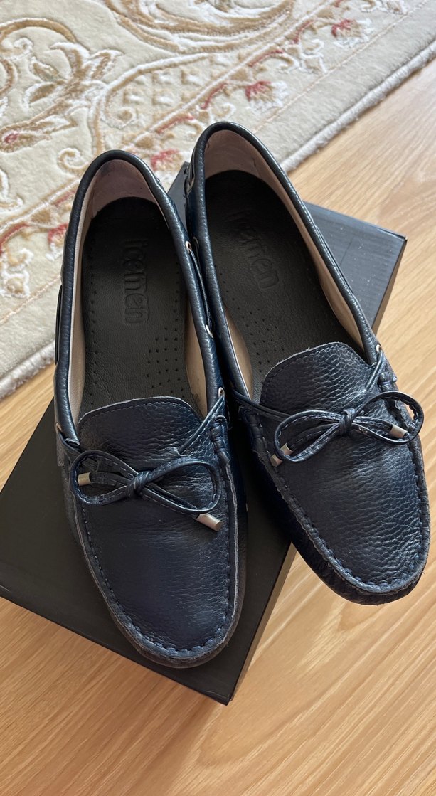Koyu mavi deri, tokalı ve blok topuklu klasik tarzda kadın babet. Günlük kullanıma uygun rahat ve şık ayakkabı.