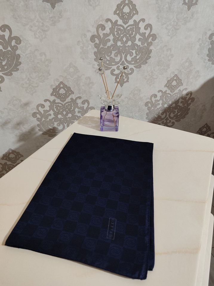 Koyu mavi renkte, ipeksi dokulu, püsküllü kadın şalı, klasik ve minimal tarzı yansıtıyor.