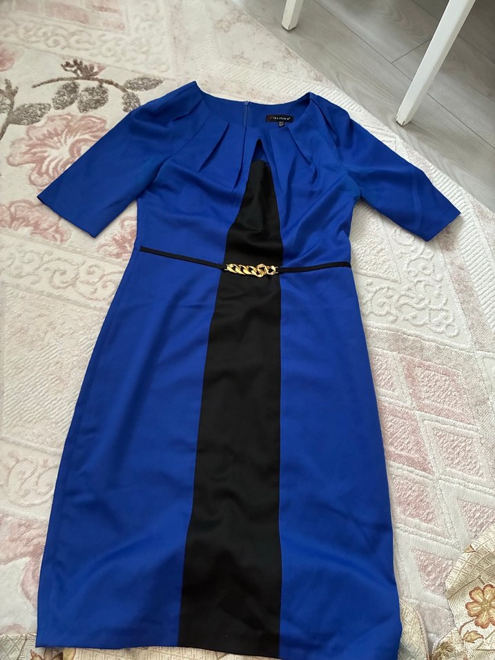 Koyu mavi ve siyah renklerde, kemerli ve altın zincir detaylı klasik kesim midi elbise. V yaka ve üç çeyrek kollu, modern klasik tarzda ofis için uygun.