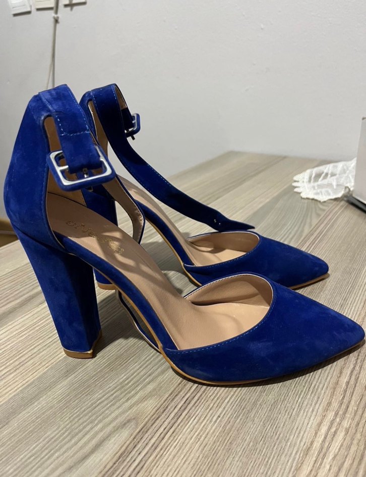 Koyu mavi süet malzemeden, tokalı kayışlı ve kalın topuklu kadın gece ayakkabısı. Klasik ve çağdaş Paris esintili, romantik akşamlar için ideal ufak bir kusuru var o da son görsel de.