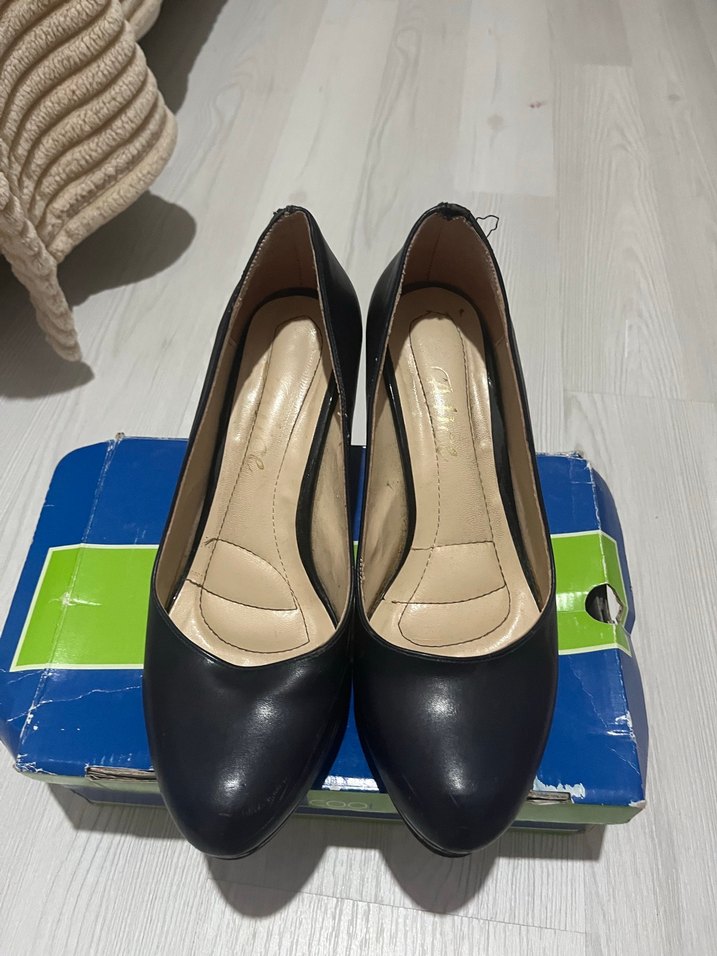 Koyu mavi, tokalı, blok topuklu kadın stilettoları. Ofis ortamı için modern klasik tarzda, şık ve rahat bir model.