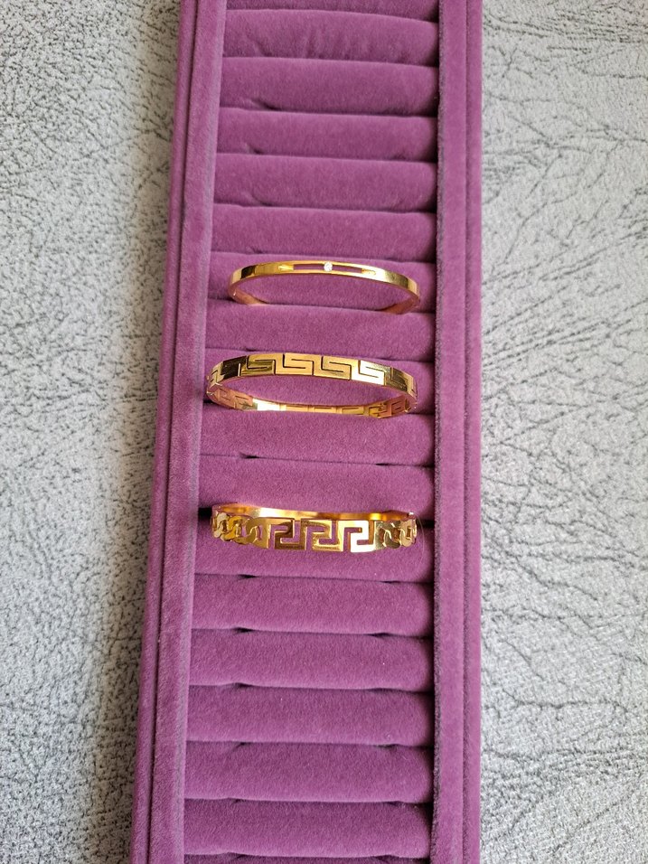 Altın renginde, tokalı ve işlemeli desenlere sahip bileklikler. Düğünler için uygun, klasik ve modern klasik tarzı yansıtıyor.