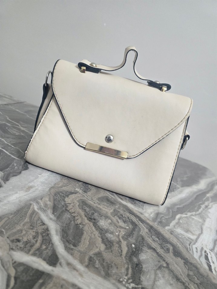 Beyaz deri çanta, tokalı detay ve gri tonlu sapıyla klasik zarafeti modern klasik tarzla birleştiriyor.