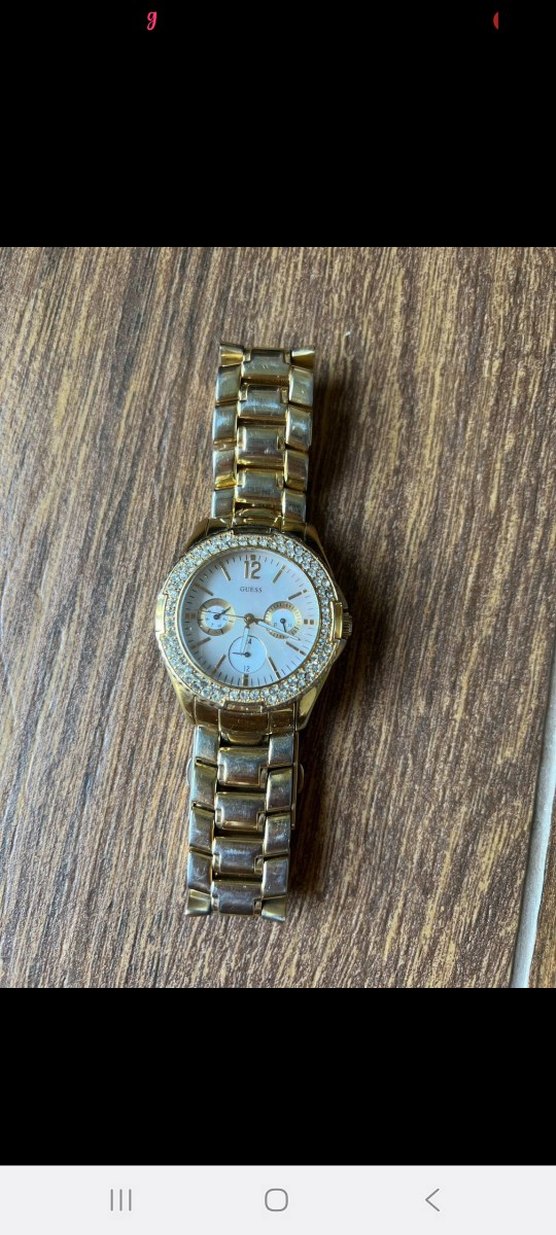 Klasik tasarımlı kadın kol saati, parlak altın renk, tokalı kayış ve kristal süslemeli çerçeveye sahiptir.⌚Guess saat rengi altın rengi ama karardı Konyalı saatten alındı orijinal fiş fatura yok gösterebilirsiniz saatine bakım yaptırırsanız süper olur.1 adet taşı düştü.o yüzden uygun tuttum.