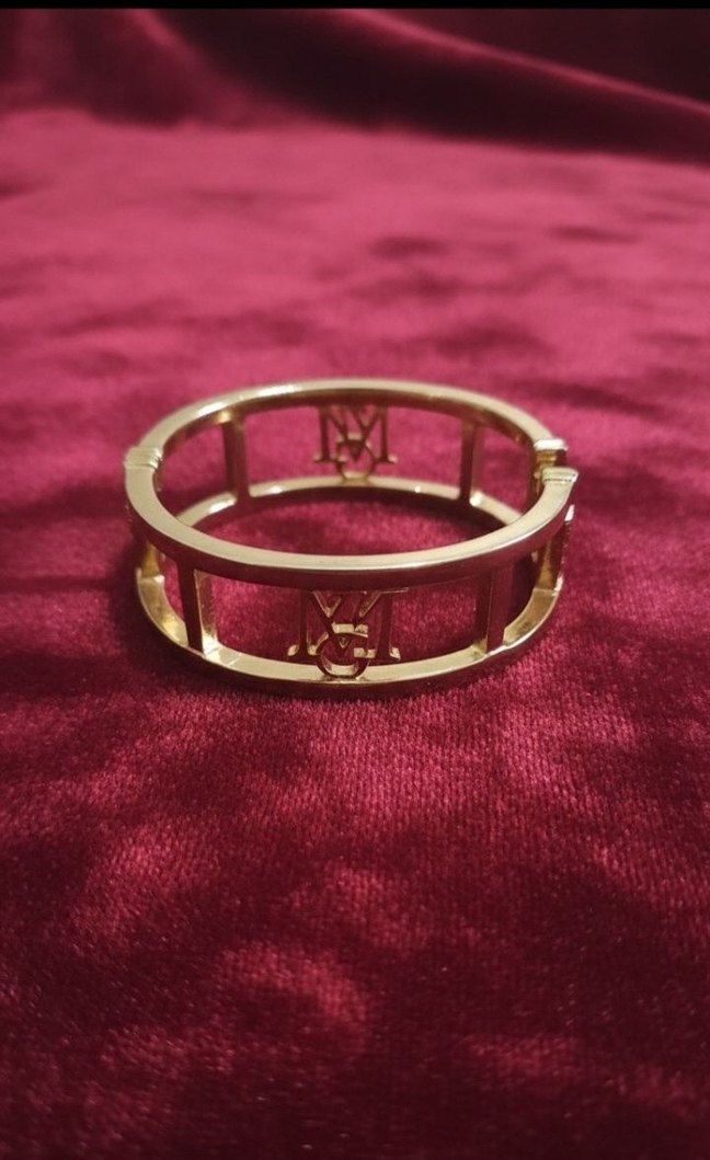 Parlak altın renkli, tokalı ve baskılı detaylara sahip kadın bileklik. Klasik zarafeti yansıtarak romantik buluşmalar ve sokak stili için uygundur.